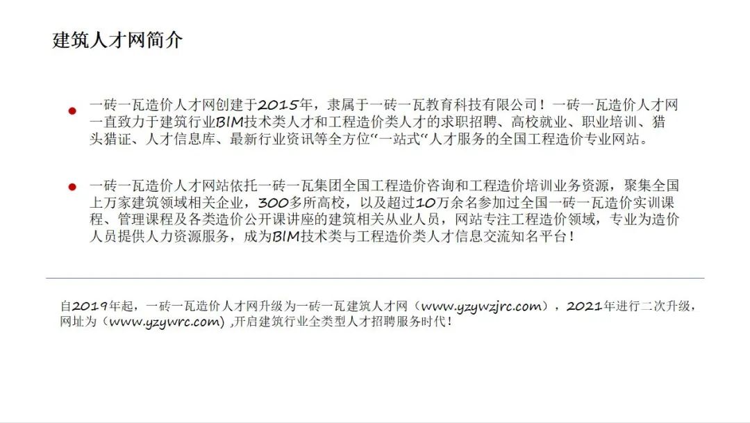 一砖一瓦人才网(www.yzywrc.com)依托一砖一瓦集团全国工程造价咨询和工程造价培训业务资源,聚集全国上万家建筑领域相关企业,300多所高校,以及超过10万余名建筑相关从业人员,网站专注工程造价领域,专业为造价人员提供人力资源服务。